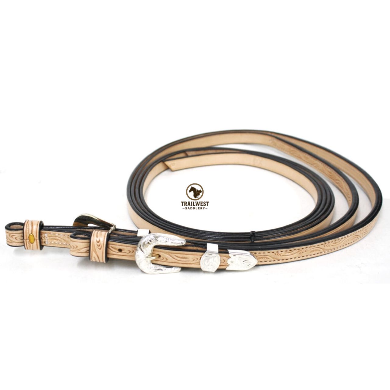 Our top of the line show grade leather split reins with a sterling overlay buckle set. These reins are double ply and hand-tooled for the first 24″ of the rein, then transition to smooth single ply leather for a great drape and feel in your hand. Reins are 3/4″ wide and are available in multiple lengths.