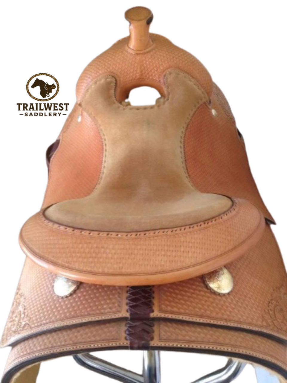 This Blue Ribbon Work Saddle features a unique small basket stamp pattern customized with floral entz corners. Built on the trusted Blue Ribbon tree with a 15.5” seat, it combines functionality, durability, and stylish craftsmanship.