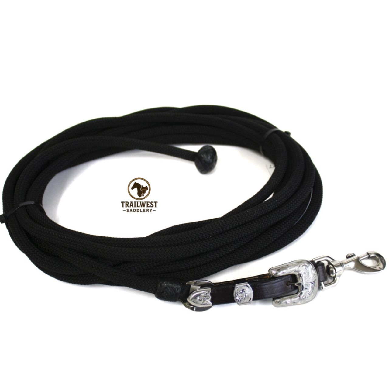 Black paracord 30′ lunge line with sterling silver buckle and nickel snap. Braided calf skin ball end.